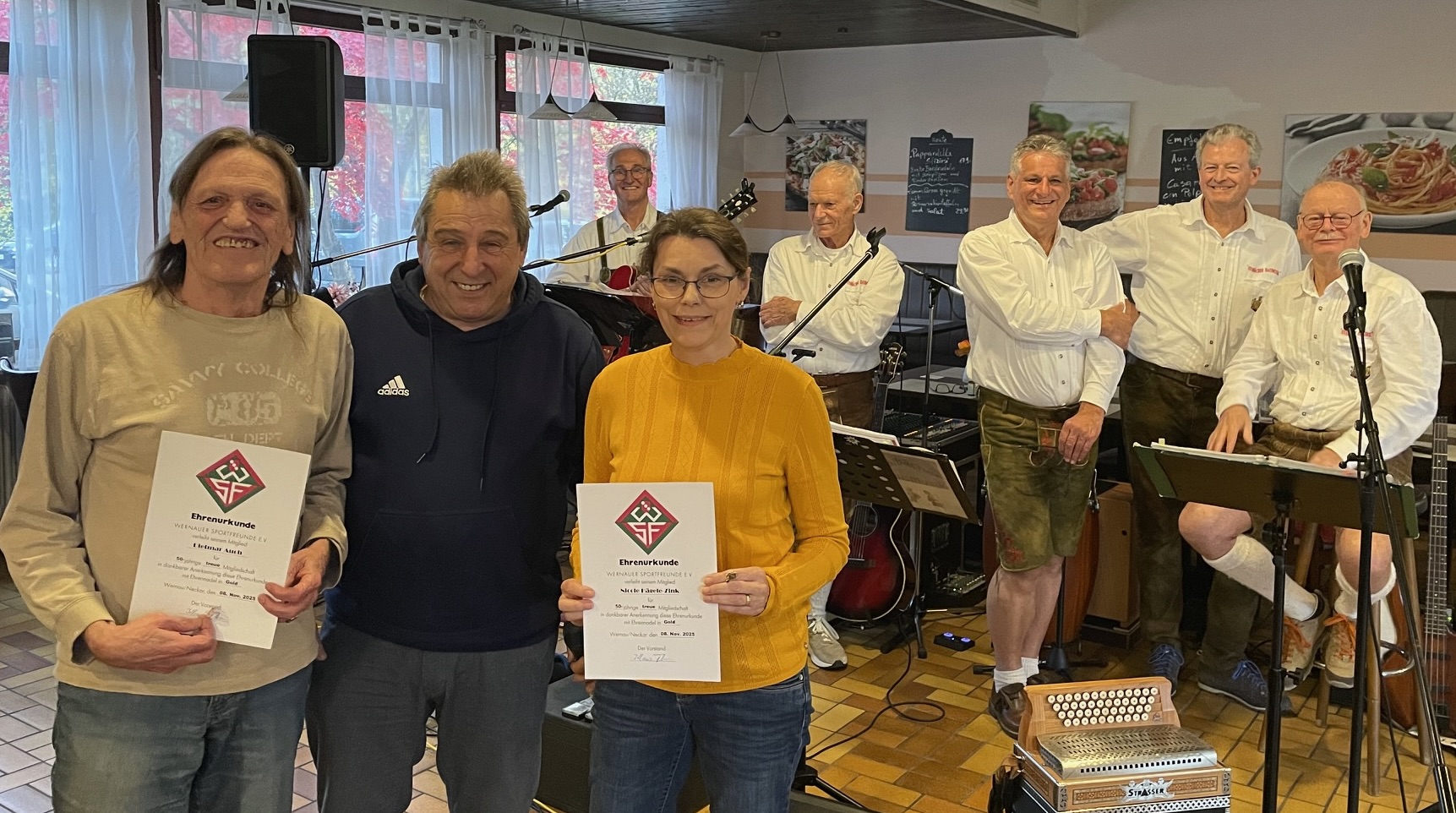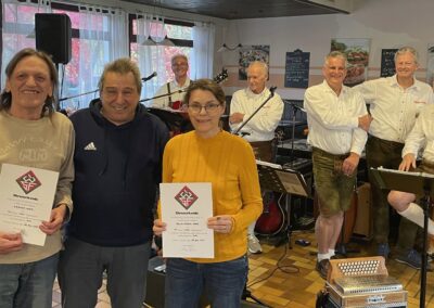 Zudem wurden fünf Männer und eine Frau für langjährige Mitgliedschaft geehrt: Bruno Denzinger (70 Jahre), Werner Schweigert, Albrecht Mayer, Nicole Hägele-Zink, Ralph Kaindl und Dietmar „Zulu“ Auch (alle 50 Jahre).