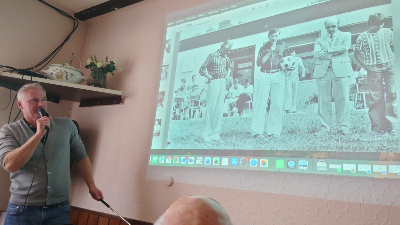 In der ersten Musikpause hielt Pressewart Hagen Stegmüller einen Vortrag zur Geschichte der Wernauer Sportfreunde und zum Bau des Clubhauses von 1973 bis 1975. Alte Protokolle zeigen, dass es ein langer Weg zur Fusion von Turnverein und Sportvereinigung war.
