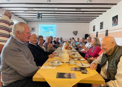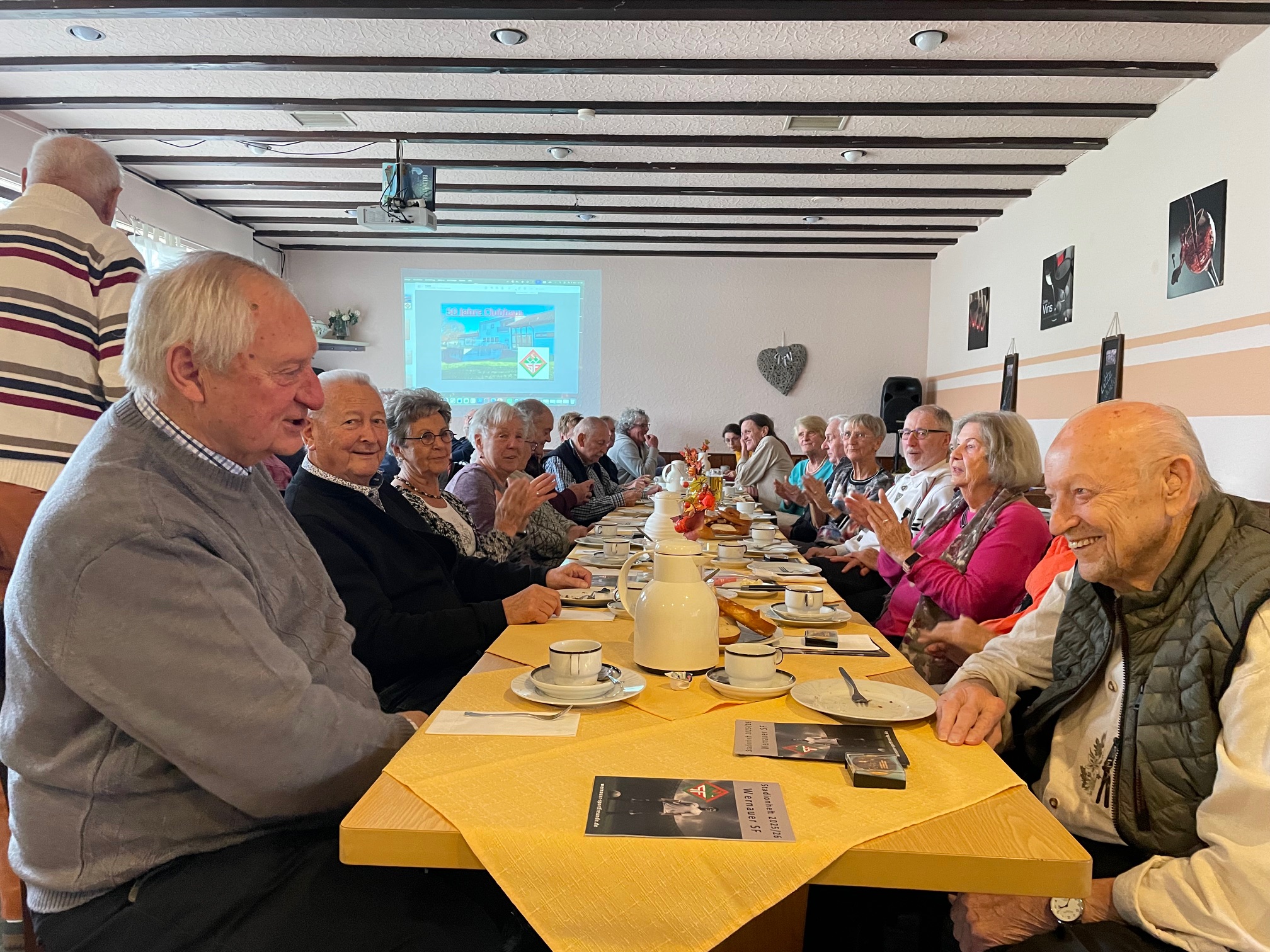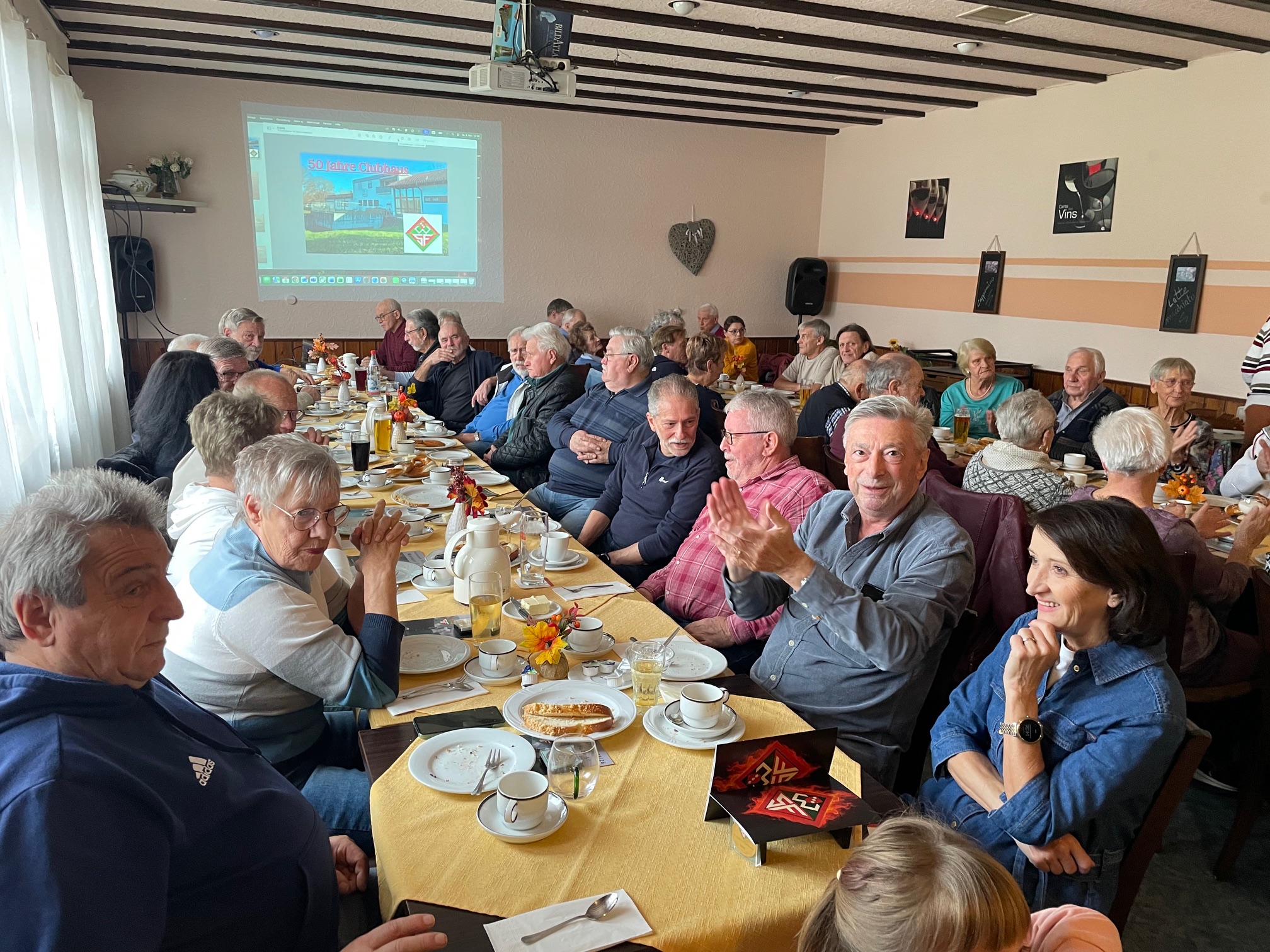 Rund 50 WSF-Mitglieder kamen zum Seniorennachmittag – dieses Jahr unter dem Motto „50 Jahre Clubhaus“. Die Stoibacher Hausmusik machte wieder ordentlich Stimmung, so dass es einige nicht auf den Sitzen hielt. Das erste Tänzchen legte Klubchef Klaus Thon mit seiner Uschi hin, weitere folgten.