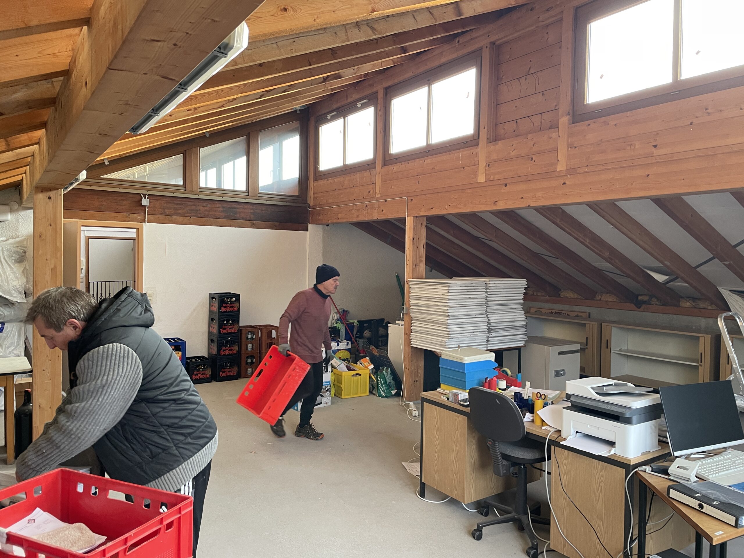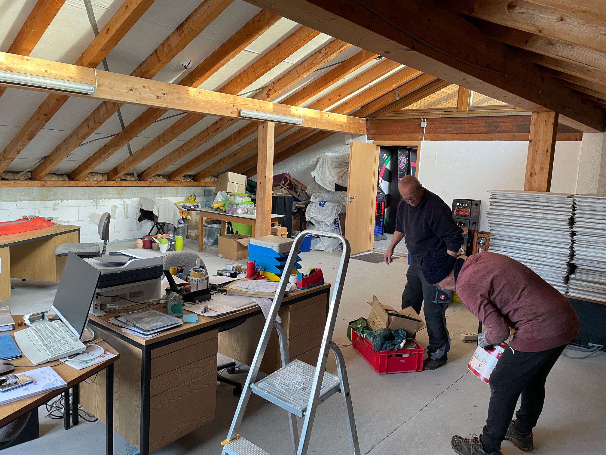 Jetzt heißt es erneut Anpacken: Durch den Umzug der Dart-Abteilung vom Stadion ins ehemalige Geschäftszimmer ist die WSF-Geschäftsstelle vorübergehend heimatlos geworden. Sie soll im sogenannten „zbV“-Raum („zur besonderen Verwendung“) direkt nebenan im Clubhaus-Obergeschoss eingerichtet werden. Dieses Zimmer wurde 35 Jahre lang nie fertiggestellt, ist immer noch im Rohbau und diente all die Jahrzehnte nur als Lagerraum, der immer weiter zugemüllt wurde.