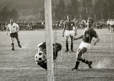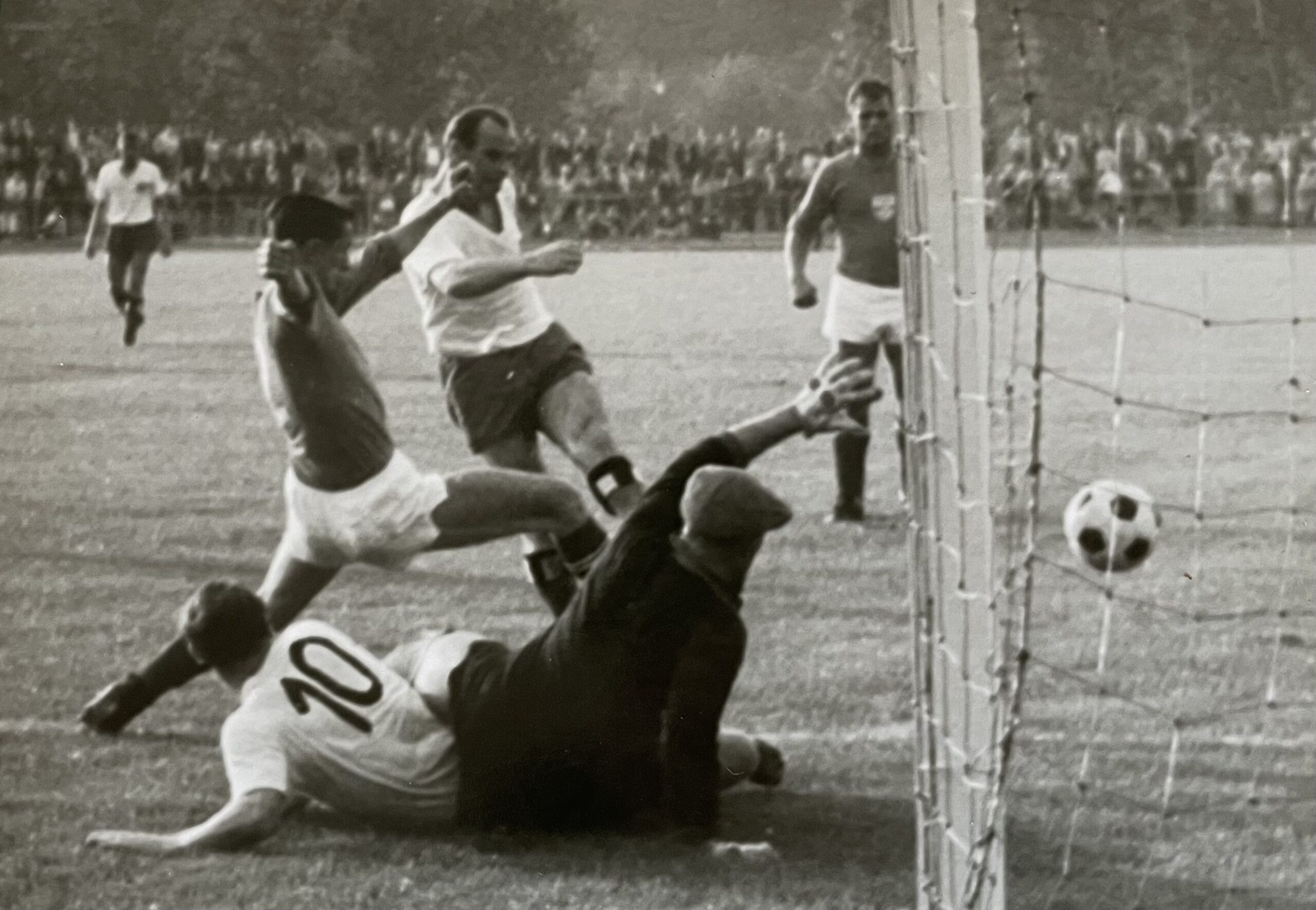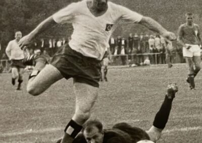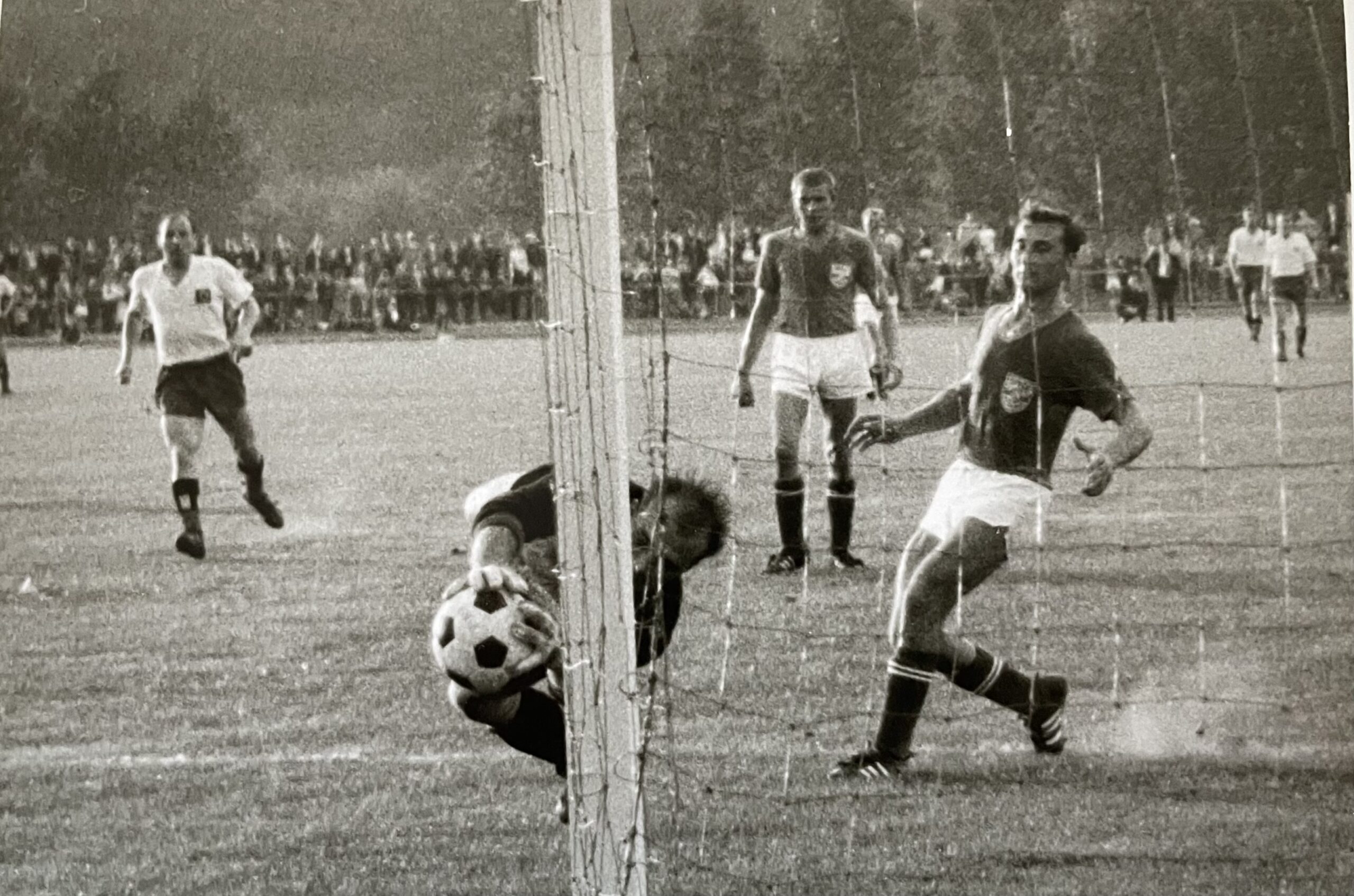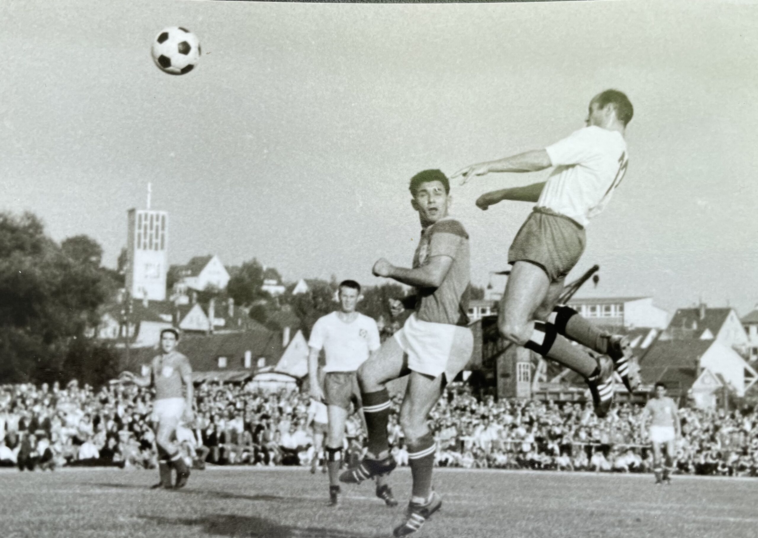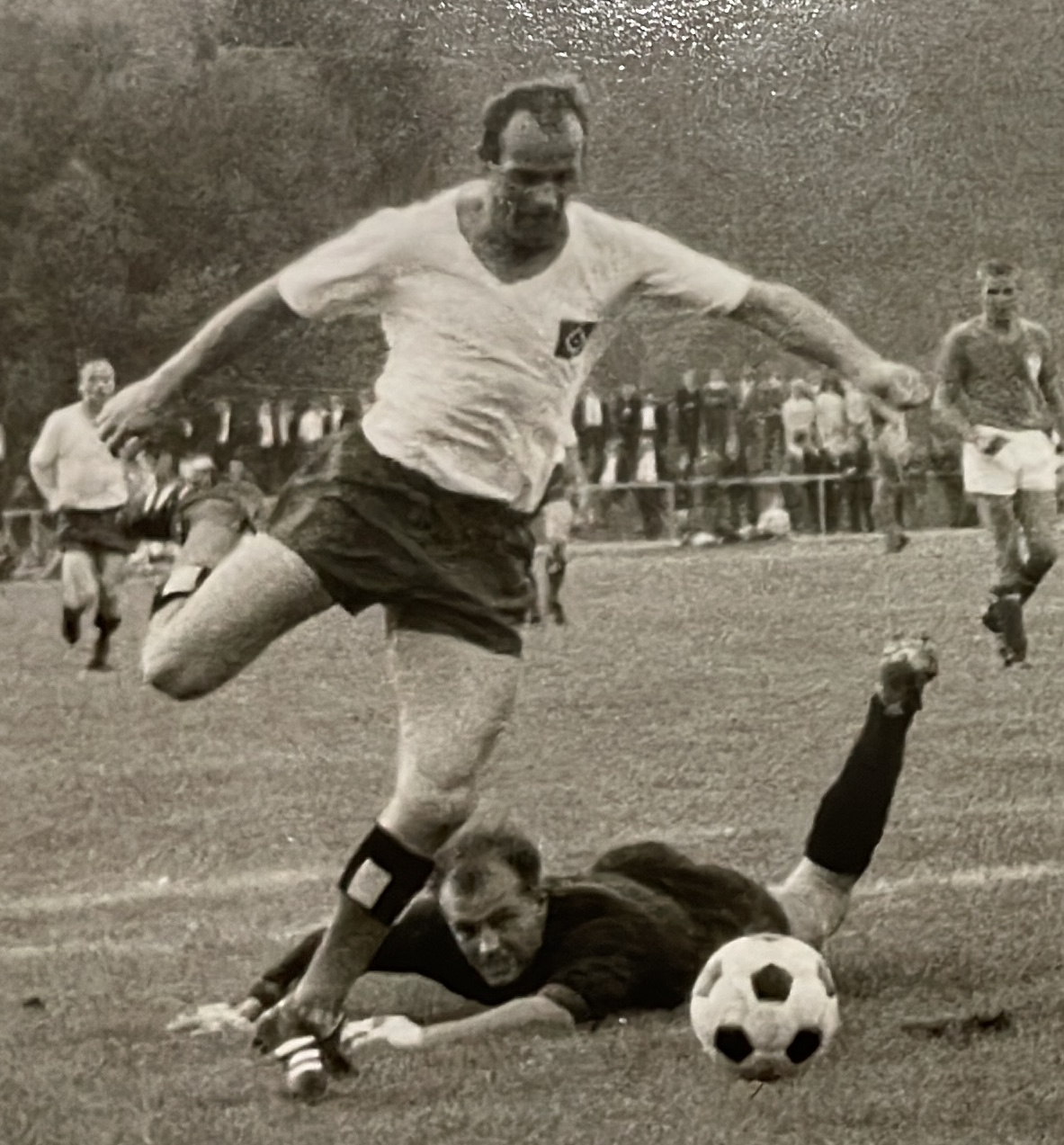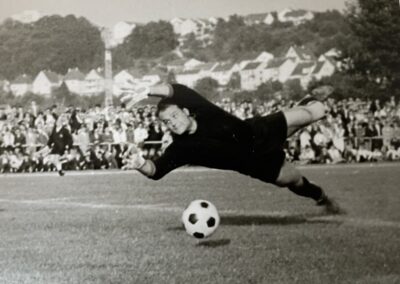 Zum Schmunzeln regt ein Foto von WSF-Torhüter Norbert Wels an. Der Keeper scheint um den Ball herumgelaufen zu sein, um dann mit dem Rücken zu den Angreifern quer in der Luft zu liegen und nach dem Ball zu hechten. Offenbar hatte es der WSF-Spielertrainer darauf abgesehen, dem Publikum eine gute Show zu bieten. Dies lässt zumindest sein verschmitzter Gesichtsausdruck erahnen.