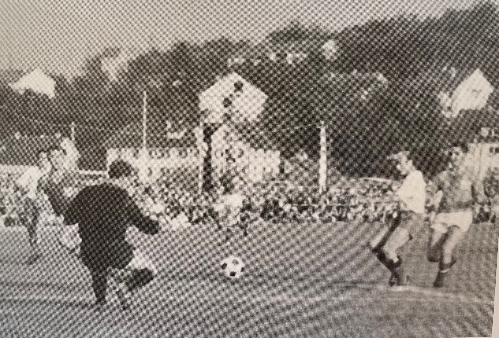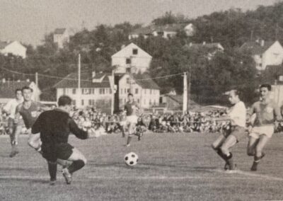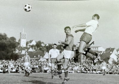 Der Hamburger SV weihte am 28. August 1966 mit einem 9:0-Sieg über die Sportvereinigung Wernau das Stadion ein. Charly Dörfel trifft, die Wernauer Spieler Hermann Latzel (li.) und Günther Höllering (hinten) kommen zu spät